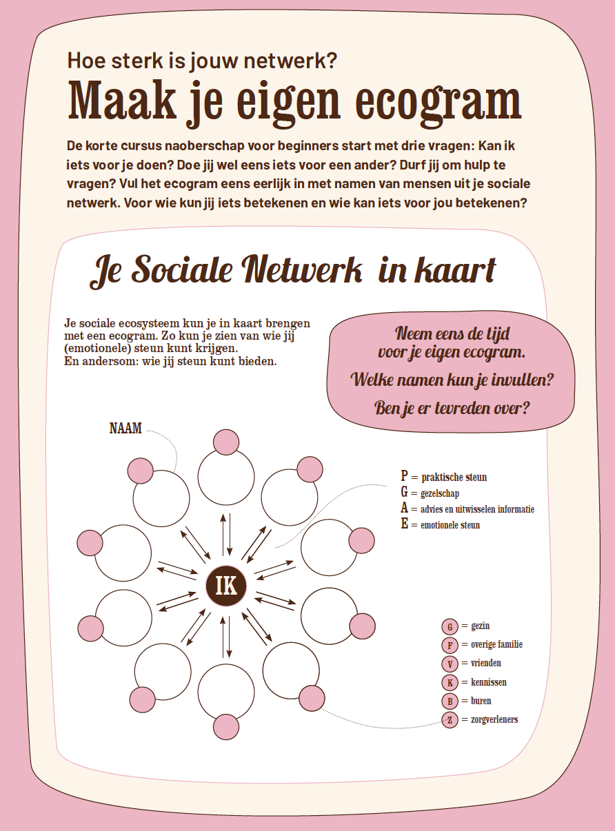 Iedere inwoner van onze gemeente zou zich bewust moeten zijn van zijn of haar sociale netwerk. Op wie kan ik rekenen als ik hulp nodig heb? Wie staat er voor me klaar? Op een zeker moment zul je je eigen netwerk – ik noem dat: je ecogram - in kaart moeten durven brengen. Dan volgt de verdiepende vraag: is het krachtig genoeg? Daarna volgen de inzichten over je nabije of verre toekomst vanzelf.’